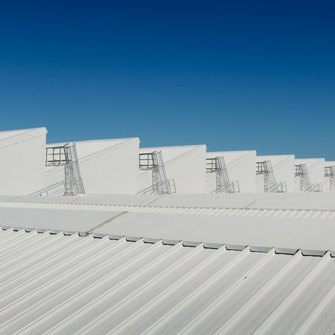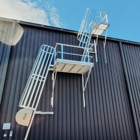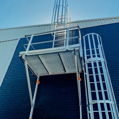 Angled rung caged ladders provide access to main roof areas up to 6.0m and access between varying roof levels above 3.5m.